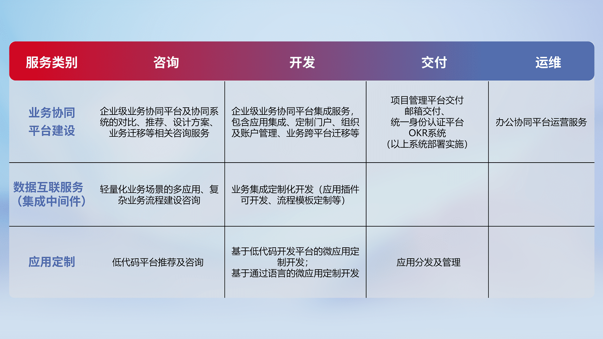 针对钉钉、、、企微、、、、IDaas等平台级产品提供产品的规划、、、方案、、、交付、、定制化开发等服务,,,实现如统一协同办公、、智能客户服务、、混合会议管理、、智能数据查询、、等业务场景,,,实现数字化转型。。
